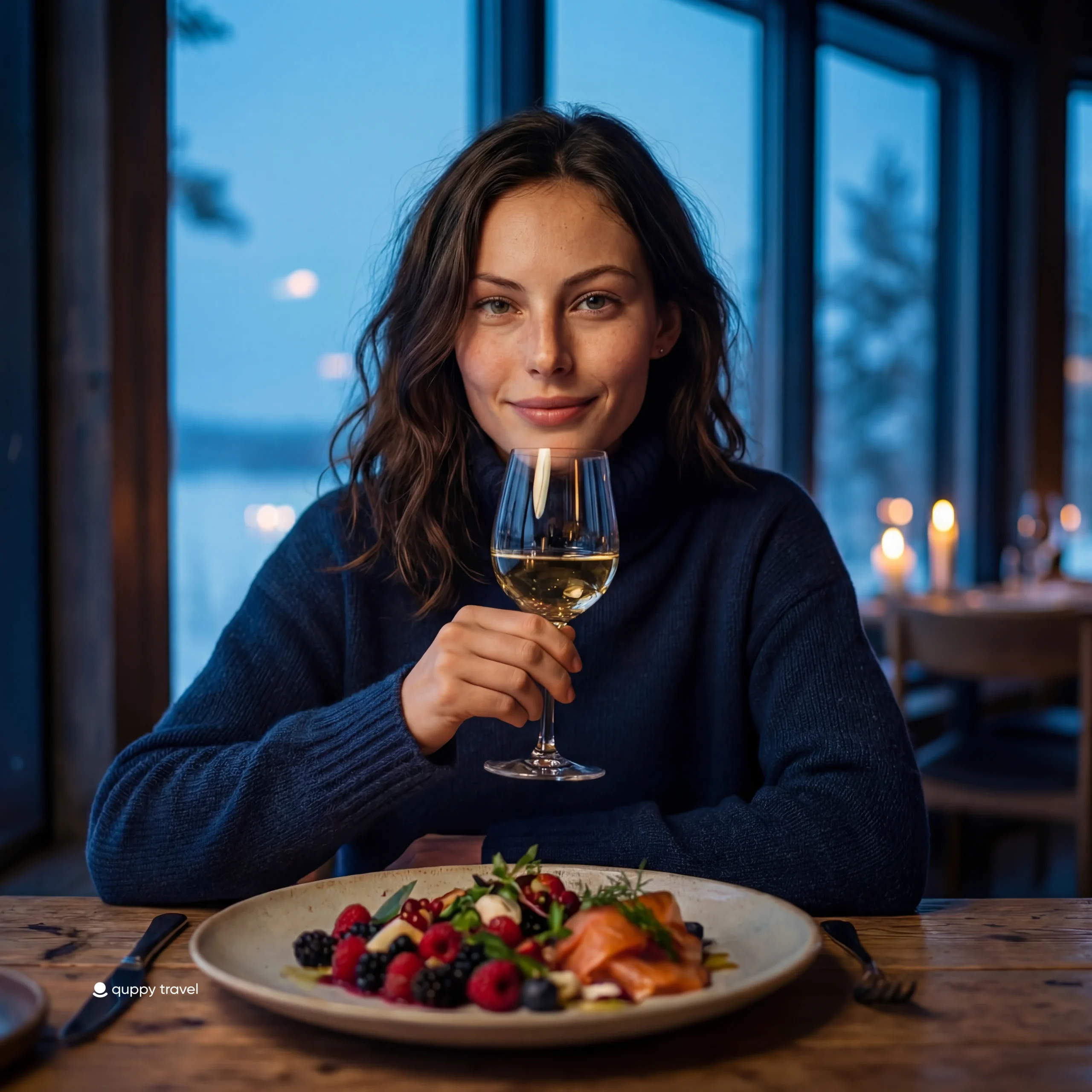 Forget heavy buffets. The food here is “New Nordic”—clean, local, and incredibly fresh. We ate what the land provided: cloudberries picked from the marshes, arctic char caught in the lake, and reindeer moss (yes, it’s delicious when fried).