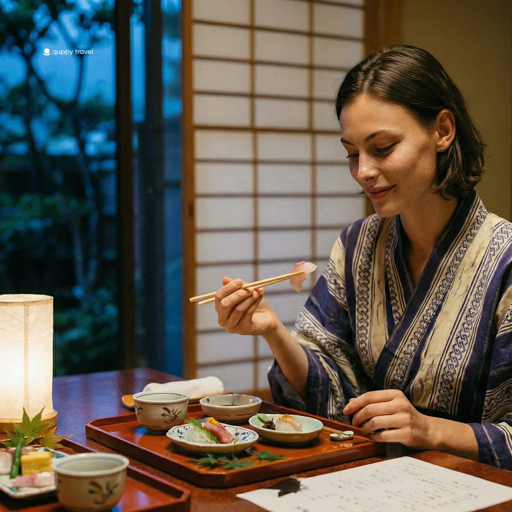 Dinner at a premium ryokan is not just a meal; it is kaiseki, a traditional multi-course dining experience that serves as an edible meditation.
