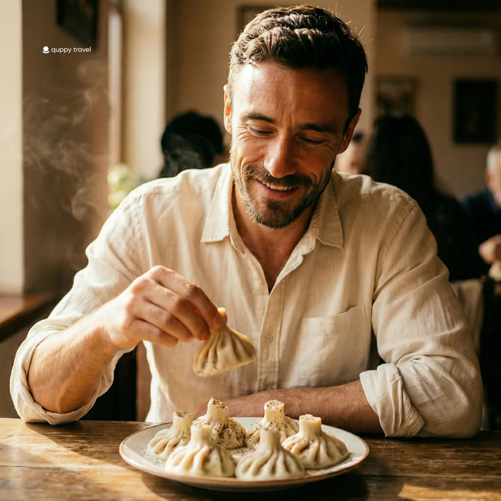 The place Alex had recommended — Pasanauri on Dadiani Street — was packed at noon. Families, construction workers, two men in suits who’d clearly walked out of a meeting specifically for this. The khinkali arrived on a metal tray, sixteen of them, slick with butter, dusted with black pepper. I picked one up. Bit a small hole in the side. Drank the broth. Then ate the rest in two bites.