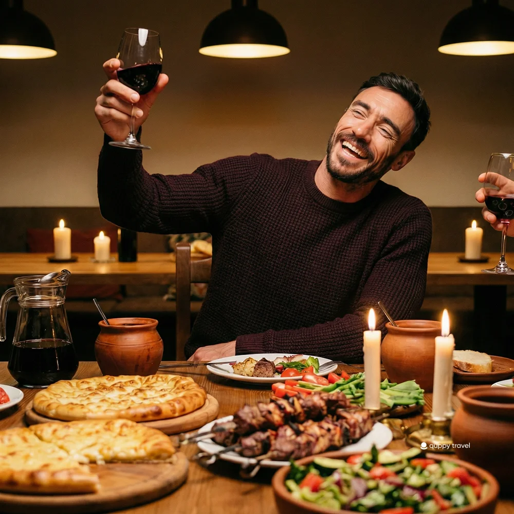 The tamada — the toastmaster — raised his glass every ten minutes. To Georgia. To friendship. To the dead. To the living. To the grape. To the soil. Each toast required a full glass of wine, drained. By the fifth toast, I’d stopped counting. By the eighth, I was making one of my own — in broken Georgian that made the entire table roar with laughter and then, inexplicably, applaud.